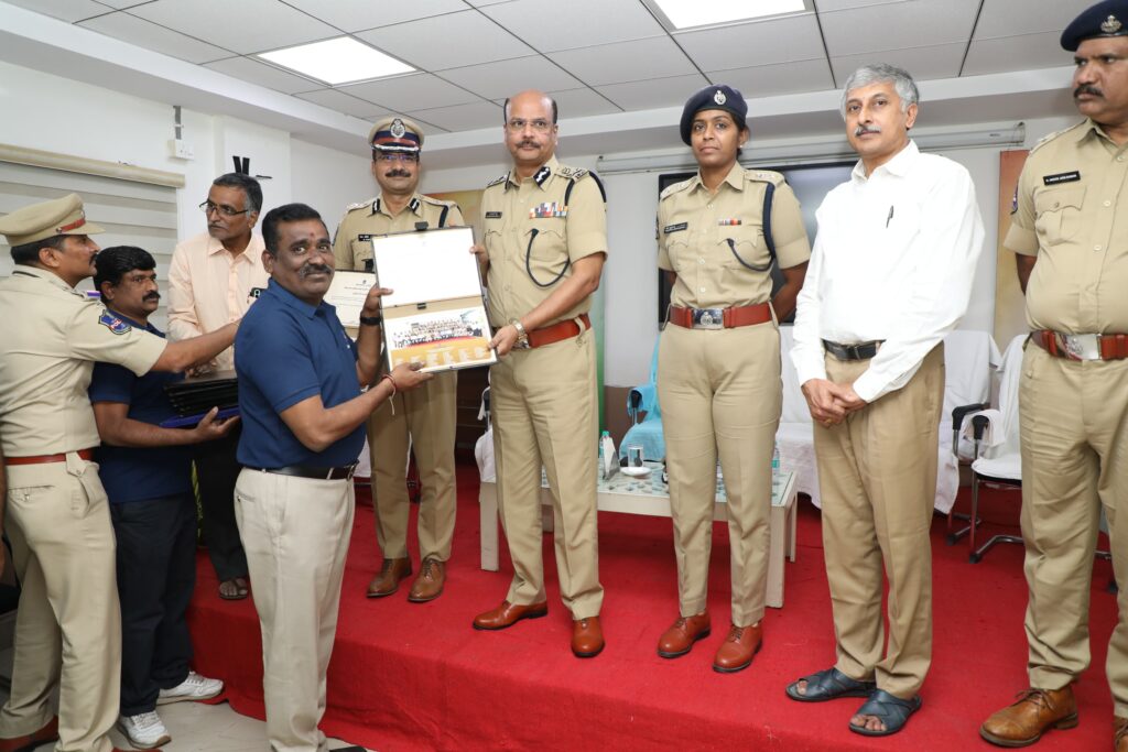 తెలంగాణ పోలీస్ సురక్ష ఆధ్వర్యంలో తెలంగాణ రాష్ట్ర పోలీస్ పి. ఆర్. ఓ లకు హైదరాబాద్ సిటీ పోలీస్ శిక్షణ కేంద్రంలో మూడు రోజుల పాటు నిర్వహించిన పి. ఆర్. ఓ శిక్షణ శిబిరంలో విజయవంతంగా శిక్షణ పూర్తి చేసిన వరంగల్ పోలీస్ కమిషనరేట్ పి.ఆర్.ఓ మన్నవ మోహన కృష్ణ అభినందిస్తూ రాష్ట్ర తెలంగాణ డిజిపి శివధర్ రెడ్డి చేతుల మీదుగా ప్రశంస పత్రాన్ని అందజేసి అభినందనలు తెలియజేసారు. ఈ కార్యక్రమంలో ఐజీ యం. రమేష్ రెడ్డితో పాటు ఇతర పోలీస్ అధికారులు పాల్గొన్నారు.